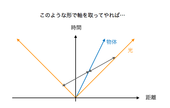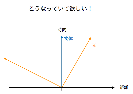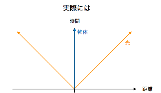 ある一点から、光が(双方向に)放出される。この点をXとする。同時に、高速の半分の速さで物体が動き始める。この時、光と物体の位置関係をグラフで表すと以下のようになるはずだ。