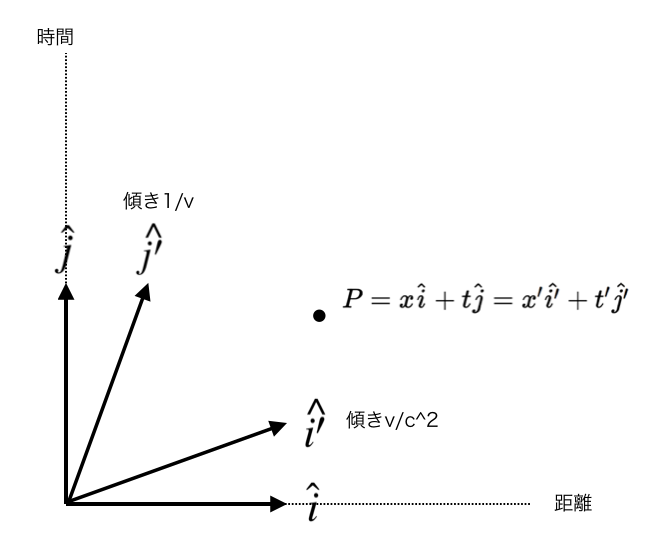 次に我々がするのは、点Xでの座標系の基底$\hat{i}$と$\hat{j}$で表されていた点を、傾き$\frac{1}{v}$の基底$\hat{i^\prime}$と傾き$\frac{v}{c^2}$の基底$\hat{j^\prime}$で表した時に、各係数の関係を調べることである。