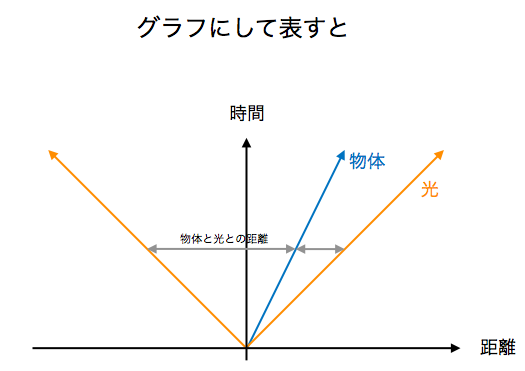 ある一点から、光が(双方向に)放出される。この点をXとする。同時に、高速の半分の速さで物体が動き始める。この時、光と物体の位置関係をグラフで表すと以下のようになるはずだ。